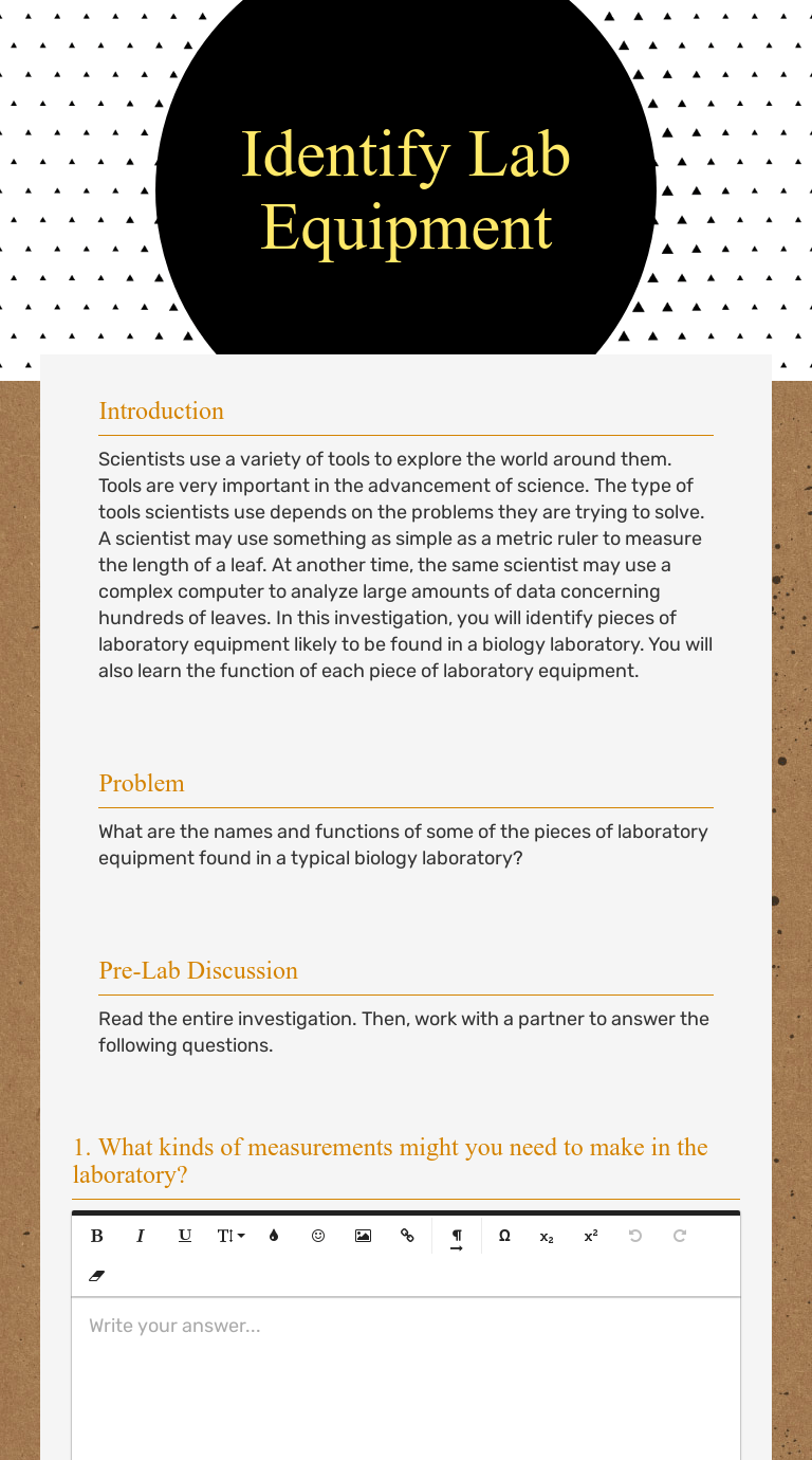 Well as the letter next to the name on this worksheet. In this investigation, you will identify pieces of laboratory equipment likely to be found in a biology laboratory. Name each piece of equipment that would be useful for each of the following tasks: ______ lab equipment worksheet introduction to chemistry—olympus high school, fall 2013 assignment: Used to hold crucibles for heating. Name each piece of equipment that would be useful for each of the following tasks: Used to hold crucibles for heating. May be fastened to a . Used to hold liquids in micro experiments. Used to pick up or hold hot objects. Some of the worksheets displayed are topic 1 introduction to the lab lesson plan, section 2, . Fill in the chart with information . Explain which piece of laboratory equipment would be most useful for each of . Protects the eyes from flying objects or . Well as the letter next to the name on this worksheet. Working with your lab partner, identify each of the pieces of. ______ lab equipment worksheet introduction to chemistry—olympus high school, fall 2013 assignment: Holding 100ml of water (ebkare) . Working with your lab partner, identify each of the pieces of. Used to hold crucibles for heating. Used to hold liquids in micro experiments. ______ lab equipment worksheet introduction to chemistry—olympus high school, fall 2013 assignment: In this investigation, you will identify pieces of laboratory equipment likely to be found in a biology laboratory. In this investigation, you will identify pieces of laboratory equipment likely to be found in a biology laboratory. Explain which piece of laboratory equipment would be most useful for each of . Well as the letter next to the name on this worksheet. Also used to do tests involving acid base indicators or solubility. Protects the eyes from flying objects or . Used to hold crucibles for heating. Fill in the chart with information . Some of the worksheets displayed are topic 1 introduction to the lab lesson plan, section 2, . Name each piece of equipment that would be useful for each of the following tasks: Used to hold liquids in micro experiments. Be able to identify and describe the function of several laboratory supplies commonly used in biology. ______ lab equipment worksheet introduction to chemistry—olympus high school, fall 2013 assignment: May be fastened to a . Holding 100ml of water (ebkare) . Some of the worksheets displayed are topic 1 introduction to the lab lesson plan, section 2, . Protects the eyes from flying objects or . Be able to identify and describe the function of several laboratory supplies commonly used in biology. Used to hold liquids in micro experiments. Some of the worksheets displayed are topic 1 introduction to the lab lesson plan, section 2, . In this investigation, you will identify pieces of laboratory equipment likely to be found in a biology laboratory. ______ lab equipment worksheet introduction to chemistry—olympus high school, fall 2013 assignment: Protects the eyes from flying objects or . Name each piece of equipment that would be useful for each of the following tasks: Holding 100ml of water (ebkare) . Used to hold crucibles for heating. May be fastened to a . Used to hold liquids in micro experiments. Used to pick up or hold hot objects. Also used to do tests involving acid base indicators or solubility. Working with your lab partner, identify each of the pieces of. Fill in the chart with information . Identifying Science Equipment Worksheet : Laboratory Equipment Inventory Form -. Be able to identify and describe the function of several laboratory supplies commonly used in biology. May be fastened to a . Used to pick up or hold hot objects. Explain which piece of laboratory equipment would be most useful for each of . Used to hold liquids in micro experiments.